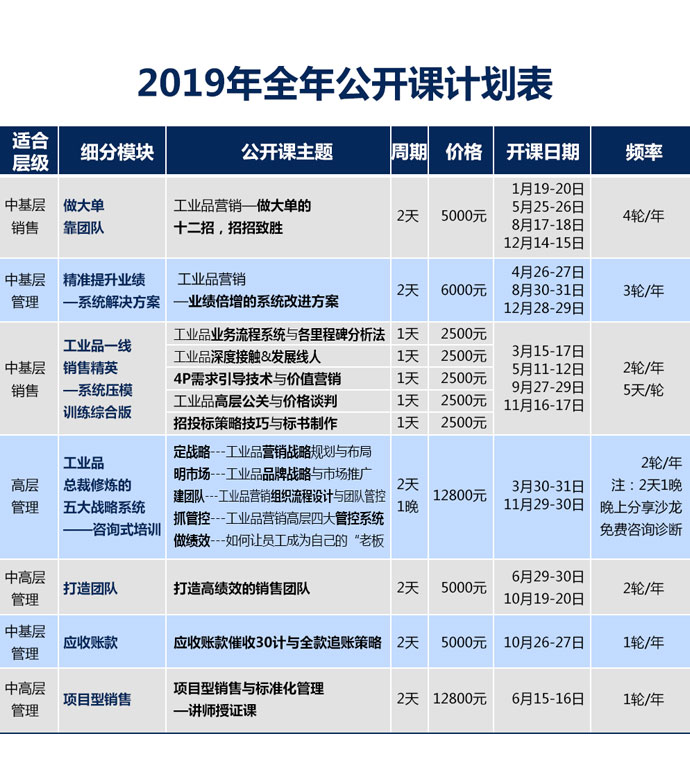 一、《業(yè)務(wù)管理體系的精細(xì)化之路》工業(yè)品企業(yè)往往關(guān)系營(yíng)銷比較盛行,所以在營(yíng)銷的過程中基本上是靠一線人員做戰(zhàn)為主,其實(shí)這個(gè)銷售過程是比較粗放的。在這個(gè)行業(yè)里經(jīng)常有這么一句話,銷售精英很難培養(yǎng)。往往要招到一個(gè)銷售精英能夠完成公司業(yè)績(jī)的20%或者30%的人才真的很難而這樣的銷售精英是我們比較看重的。但是我們通常會(huì)發(fā)現(xiàn),往往這樣的人才比較難培養(yǎng),即使培養(yǎng)起來(lái),并不見得和公司粘得很緊。所以這就導(dǎo)致營(yíng)銷團(tuán)隊(duì)和公司面臨很尷尬的問題。所以工業(yè)品營(yíng)銷研究院針對(duì)這個(gè)問題我們推出了這個(gè)系統(tǒng)能夠解決工業(yè)品企業(yè)的困難,這套體系基于18年來(lái)對(duì)300多家工業(yè)品企業(yè)做營(yíng)銷咨詢包括近3000多家企業(yè)的培訓(xùn)總結(jié)出來(lái)的一套體系。 二、《業(yè)務(wù)管理體系標(biāo)準(zhǔn)化流程與項(xiàng)目管理》 本課程從工業(yè)品銷售自身獨(dú)特點(diǎn)出發(fā),解析工業(yè)品營(yíng)銷的5大特性和8大困惑,明確業(yè)務(wù)流程過程中應(yīng)有的14個(gè)不同層次的排列邏輯,通過講解核心知識(shí)點(diǎn)及工具方法,結(jié)合案例及模擬演練,幫助銷售人員了解各個(gè)關(guān)鍵節(jié)點(diǎn)的內(nèi)容及含義、清晰劃分項(xiàng)目所處階段,并擁有利用精細(xì)化管理思路來(lái)梳理業(yè)務(wù)流程的能力。在營(yíng)銷及服務(wù)管理中,針對(duì)每個(gè)節(jié)點(diǎn)進(jìn)行有效質(zhì)量控制,通過每個(gè)過程細(xì)節(jié)進(jìn)行精細(xì)化管理,從而達(dá)到全面營(yíng)銷質(zhì)量管理。 三、《七步分析工具——業(yè)務(wù)管理體系的實(shí)戰(zhàn)運(yùn)用》 所謂實(shí)戰(zhàn)七步分析法是一套標(biāo)準(zhǔn)化的流程體系,在這個(gè)體系中,分為七個(gè)步驟去分析: 1﹑明確規(guī)范化的業(yè)務(wù)流程體系 2﹑明確業(yè)務(wù)流程體系的里程碑 3﹑明確里程碑的工作任務(wù)清單 4﹑完成工作任務(wù)清單的日?;顒?dòng) 5﹑每一個(gè)日常活動(dòng)必須達(dá)成目的 6﹑達(dá)成目的,需要的具體策略方法 7﹑完成策略方法,需要的常用話術(shù) 四、《信息收集與管理》 1、深度接觸——工作內(nèi)容 2、嘗試接觸——線人的要求 3、嘗試接觸——線人的十三招 4、關(guān)系維護(hù)——五橫五縱 ![]()