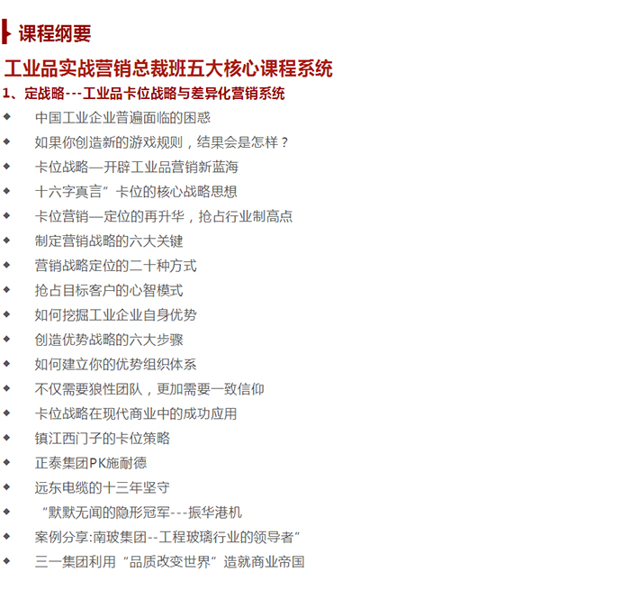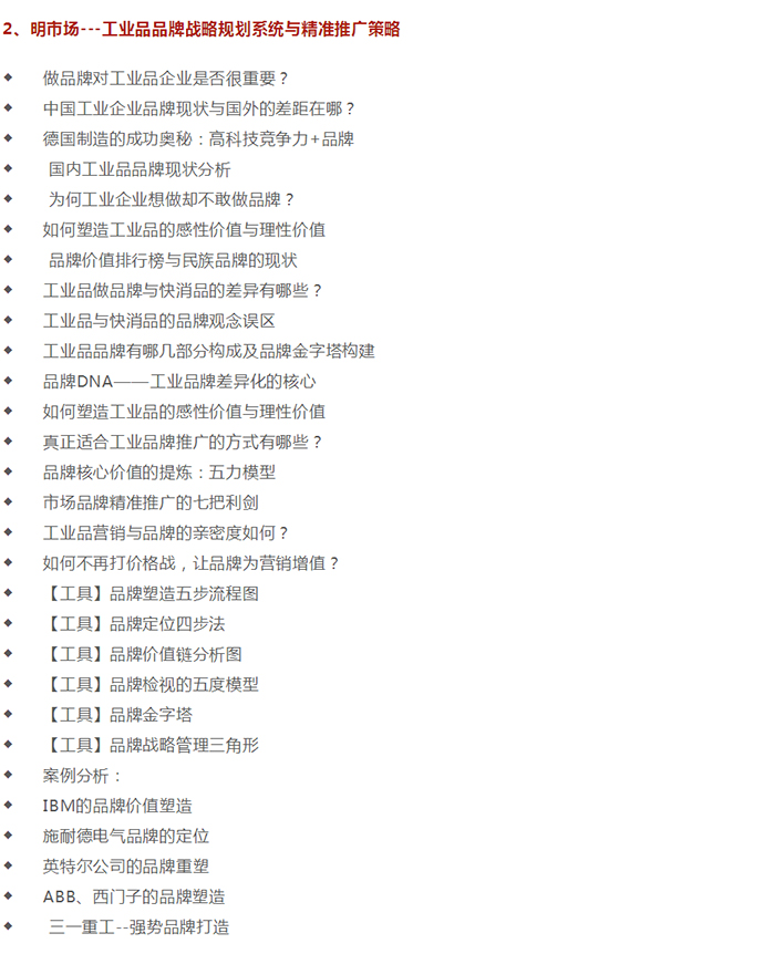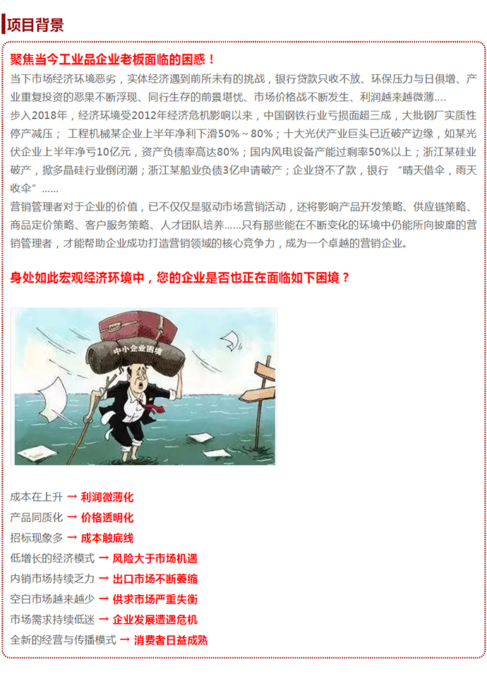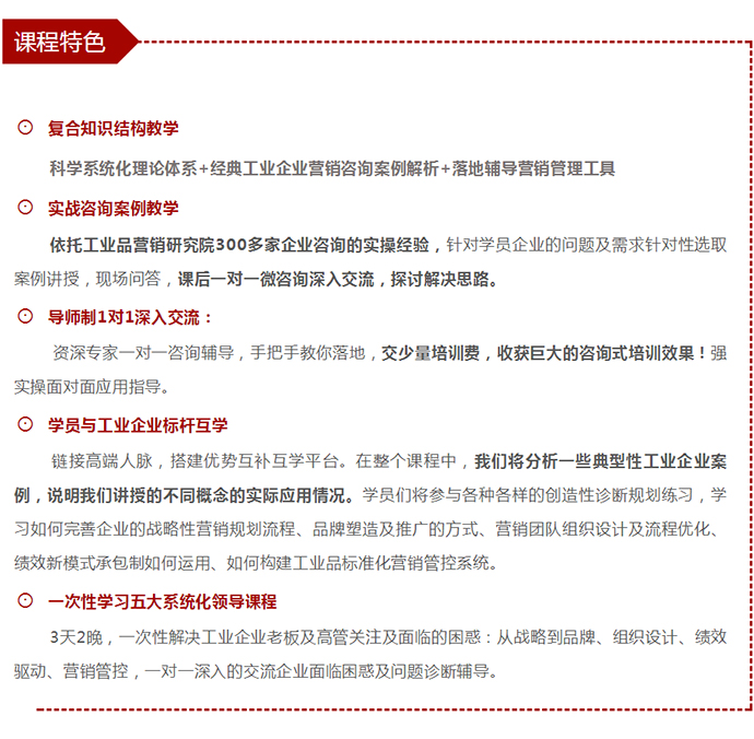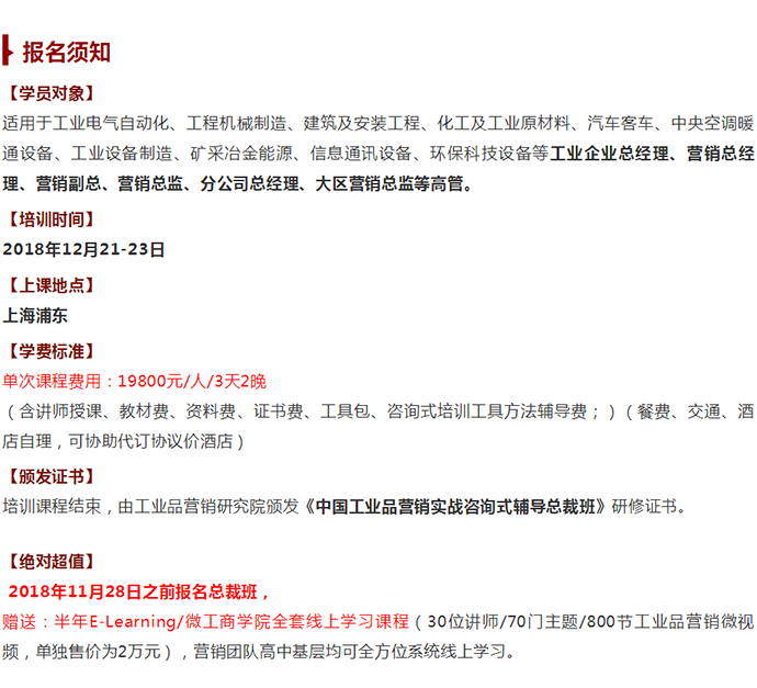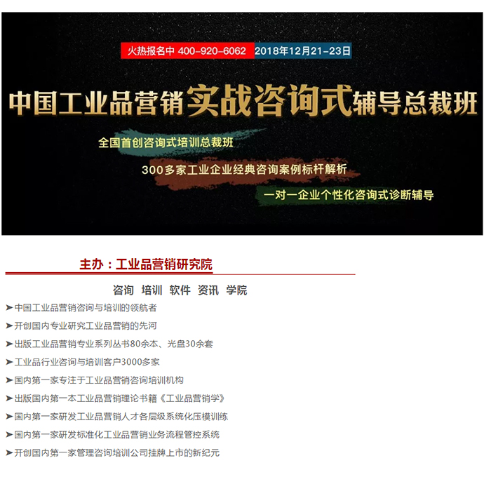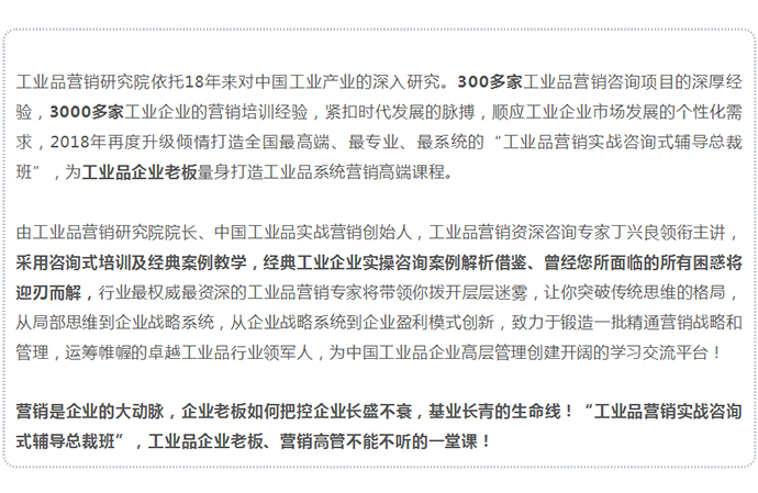【總裁班開課預告】12月21-23日 中國工業(yè)品營銷實戰(zhàn)咨詢式輔導總裁班! 點擊次數(shù):6159發(fā)布時間:2018-6-28 11:15:45 上一條:【人才壓模開課預告】7月26-29日 工業(yè)品營銷精英人才壓模系統(tǒng)公開課下一條:【人才壓模開課預告】11月22-25日 工業(yè)品營銷精英人才壓模系統(tǒng)公開課