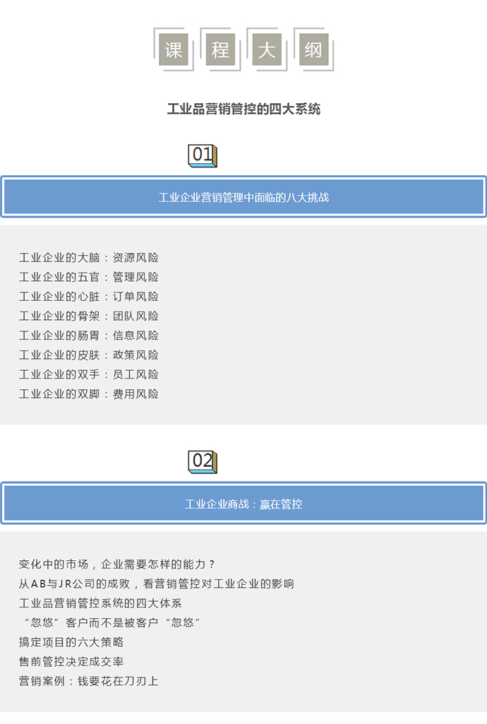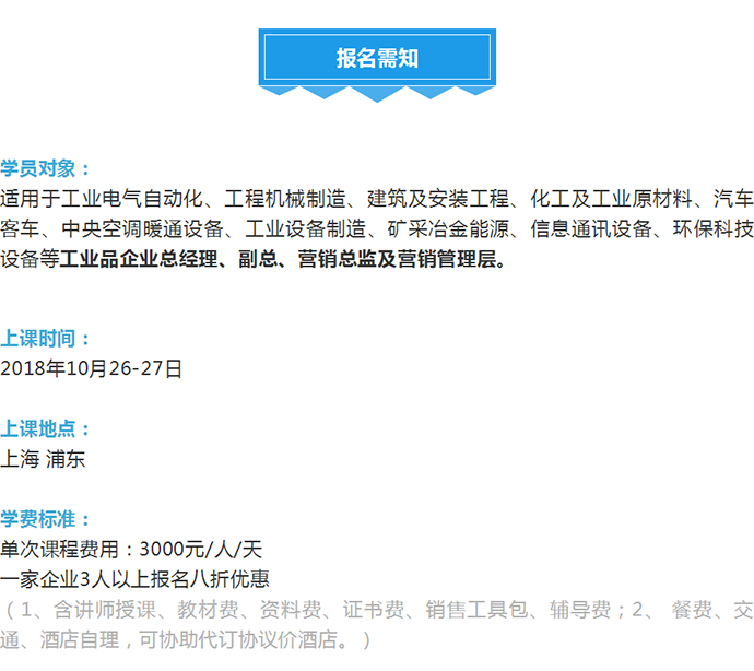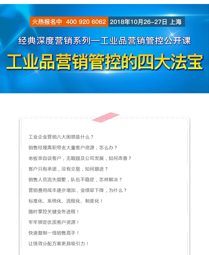 【營(yíng)銷(xiāo)管控公開(kāi)課預(yù)告】10月26-27日 深度營(yíng)銷(xiāo)管控系列“工業(yè)品營(yíng)銷(xiāo)管控”公開(kāi)課! 點(diǎn)擊次數(shù):5962發(fā)布時(shí)間:2018-6-28 11:24:19 上一條:【人才壓模開(kāi)課預(yù)告】11月22-25日 工業(yè)品營(yíng)銷(xiāo)精英人才壓模系統(tǒng)公開(kāi)課下一條:【新產(chǎn)品品牌及推廣開(kāi)課預(yù)告】 10月12-14日 工業(yè)新產(chǎn)品市場(chǎng)規(guī)劃與推廣傳播策略公開(kāi)課