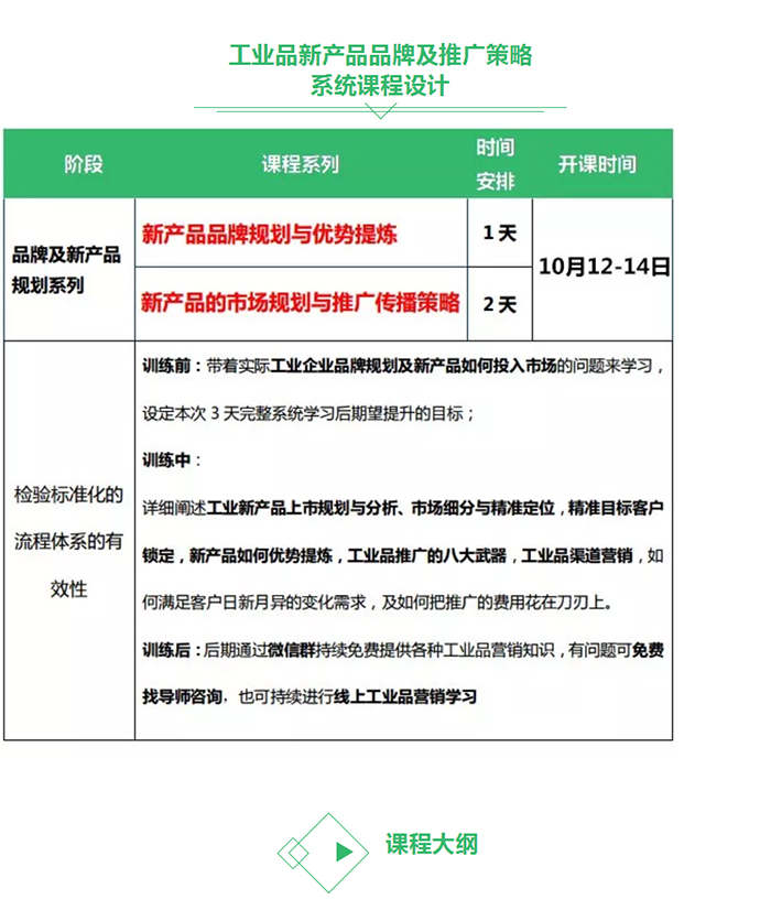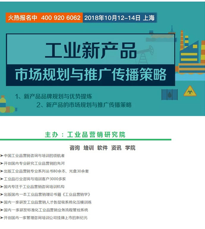 【新產品品牌及推廣開課預告】 10月12-14日 工業(yè)新產品市場規(guī)劃與推廣傳播策略公開課 點擊次數(shù):7080發(fā)布時間:2018-6-28 11:27:40 上一條:【營銷管控公開課預告】10月26-27日 深度營銷管控系列“工業(yè)品營銷管控”公開課!下一條:【大客戶營銷公開課預告】 9月14-16日 經典工業(yè)品大客戶營銷系統(tǒng)公開課