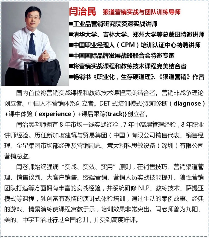 20%的客戶(hù)創(chuàng)造80%的利潤(rùn),如何把控及經(jīng)營(yíng)好這20%的大客戶(hù),利用3500個(gè)工業(yè)品大額產(chǎn)品的銷(xiāo)售案例研究出的銷(xiāo)售智慧,培訓(xùn)過(guò)全國(guó)60%大中型知名工業(yè)企業(yè),獲得一致好評(píng)的經(jīng)典課程體系!