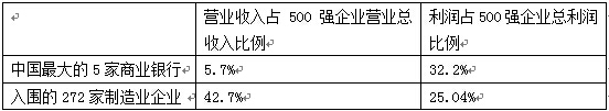 中國企業(yè)聯(lián)合會發(fā)布的《2012中國500強發(fā)展報告》顯示,制造業(yè)與商業(yè)銀行業(yè)之間的效益“鴻溝”在擴大。