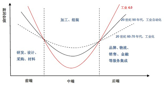 隨著新一次“工業(yè)革命”工業(yè)4.0的到來,制造業(yè)微笑曲線的兩端將更為陡峭,中端的制造環(huán)節(jié)價值將進一步被攤薄,特別是當(dāng)前我國勞動力成本高漲后,制造業(yè)的利潤進一步被擠壓,向兩端索取增加值已經(jīng)迫在眉睫。