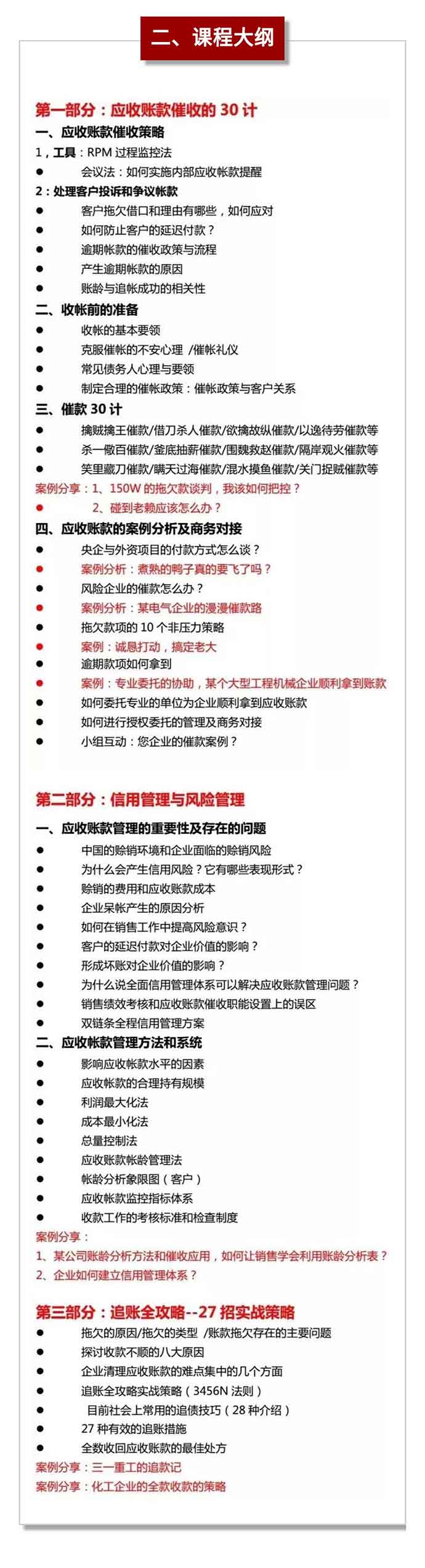 1-從銷售催收實戰(zhàn)技巧的角度來總結(jié)催款30計的策略;從企業(yè)信用管理與風(fēng)險防范的角度來分析風(fēng)險管控;催收專家從落地執(zhí)行的角度來分析如何才能確保款項有效回收,甚至可以把催收實戰(zhàn)的感悟與經(jīng)驗進(jìn)行系統(tǒng)整合并和盤托出,2天時間學(xué)到催收高手10年的寶貴經(jīng)驗,形成催收、信用、追賬一站式落地執(zhí)行的方案。