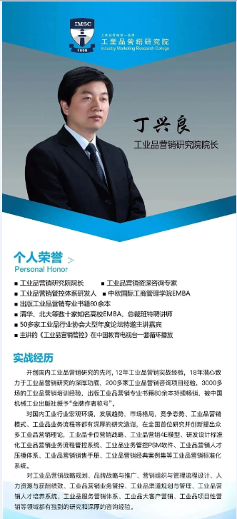 工業(yè)品營(yíng)銷研究院,2003年專注于工業(yè)品營(yíng)銷研究領(lǐng)域,創(chuàng)始人丁興良院長(zhǎng)攜手?jǐn)?shù)位工業(yè)品營(yíng)銷專家發(fā)起,是中國(guó)最早專注于工業(yè)品營(yíng)銷咨詢與培訓(xùn)的專業(yè)顧問(wèn)機(jī)構(gòu),在國(guó)內(nèi)第一家提出工業(yè)品營(yíng)銷概念,擁有最懂工業(yè)品營(yíng)銷咨詢和培訓(xùn)的頂尖實(shí)戰(zhàn)派專家實(shí)力團(tuán)隊(duì),熟知工業(yè)品營(yíng)銷特征,深諳工業(yè)品營(yíng)銷模式,能夠?yàn)楣I(yè)企業(yè)提供最具有針對(duì)性的落地營(yíng)銷解決方案和營(yíng)銷人才培養(yǎng)系統(tǒng)。