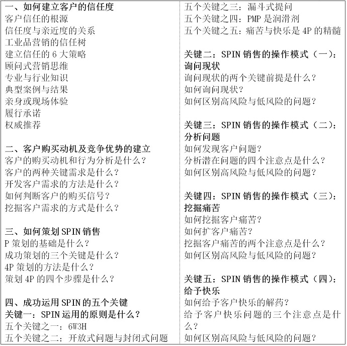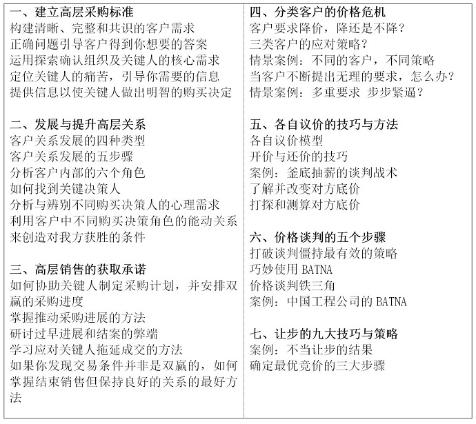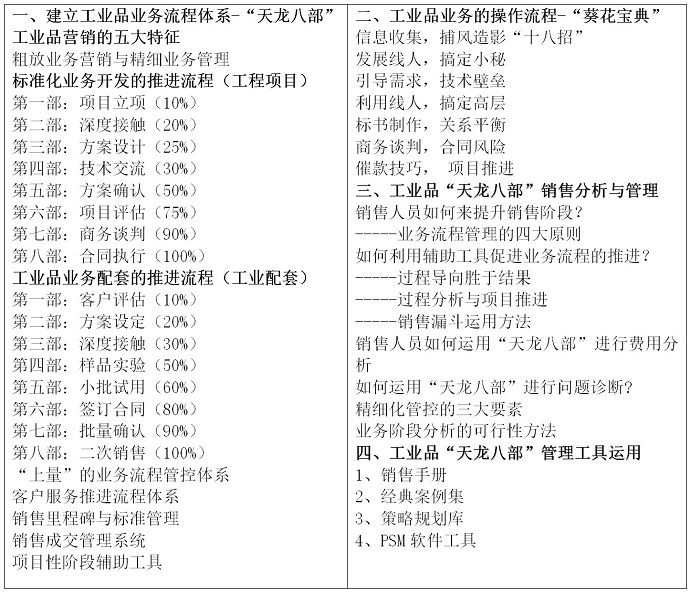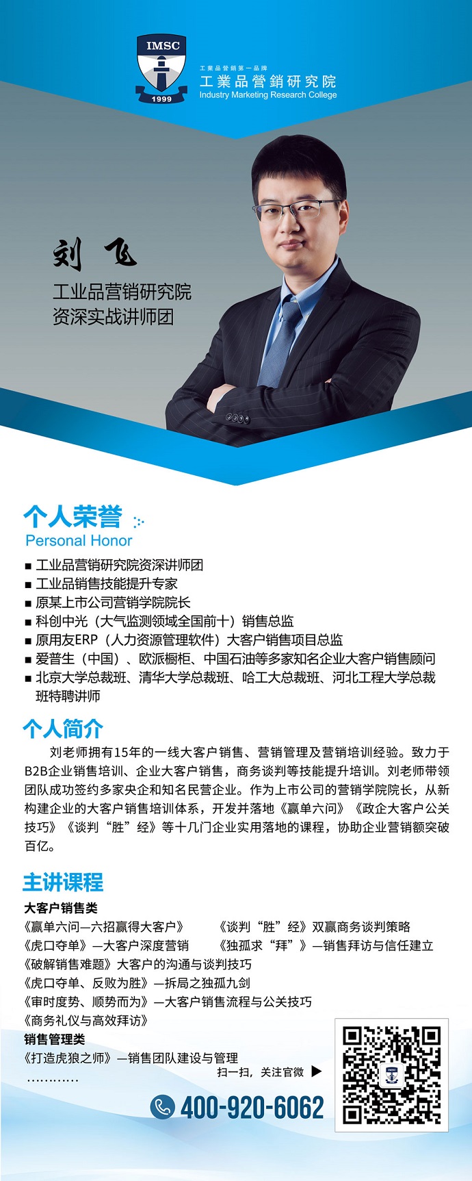 一、【工業(yè)品企業(yè)營銷人才培養(yǎng)的8大困惑】 1.新人的人數(shù)增長非???,沒有系統(tǒng)化的培訓(xùn),就直接投向市場(chǎng),導(dǎo)致無法勝任崗位的要求,得罪客戶,維護(hù)困難,影響銷售; 2.新人自己出不了單,導(dǎo)致積極性不高,激情不夠,培訓(xùn)不足,心態(tài)受到了很大的打擊,導(dǎo)致人才流失,成本較高; 3.老人基本上缺乏有效的管理經(jīng)驗(yàn),業(yè)務(wù)出身,銷售能力較強(qiáng),但是無法帶領(lǐng)新人,或帶領(lǐng)新人比較麻煩,與其讓培養(yǎng),不如自己干,無法勝任管理崗位的要求; 4.目前沒有一套成熟的經(jīng)驗(yàn)或者體系,來有效地復(fù)制或培養(yǎng)新人,導(dǎo)致經(jīng)驗(yàn)無法提煉,更沒有相應(yīng)的銷售手冊(cè),經(jīng)典案例來培養(yǎng)他人; 5.目前,公司的培訓(xùn)體系不夠完善,基本上靠外部培訓(xùn)為主,內(nèi)部無論是從經(jīng)驗(yàn)的角度、文化的傳承,費(fèi)用可以更節(jié)約一些,因此內(nèi)部成立培訓(xùn)師隊(duì)伍就非常重要; 6.銷售系統(tǒng)人事管理工作全部壓在直線經(jīng)理身上,人力資源管理缺位導(dǎo)致其功能不能充分發(fā)揮 ; 7.銷售系統(tǒng)缺乏人力規(guī)劃,人員需求和供給靠感覺,缺乏整體感造成不協(xié)調(diào),人員招聘的隨意性大; 8.公司的人員培訓(xùn)缺乏或培訓(xùn)體系不完善,缺乏培訓(xùn)的需求分析和培訓(xùn)總結(jié),培訓(xùn)的實(shí)施簡單,員工發(fā)展后勁不足 如何搭建科學(xué)化、系統(tǒng)化的工業(yè)品銷售業(yè)務(wù)流程+解析業(yè)務(wù)流程各里程碑任務(wù)清單+輔導(dǎo)落地工具方法,快速系統(tǒng)化打造優(yōu)秀工業(yè)品精英人才 工業(yè)品營銷研究院連續(xù)十多年為幾百家工業(yè)企業(yè)打造過工業(yè)品銷售人才壓模訓(xùn)練系統(tǒng),輔助工業(yè)品銷售手冊(cè),工業(yè)品營銷管控軟件落地,助力眾多工業(yè)企業(yè)完善銷售流程體系! 二、課程大綱: 課程主題1:【建立標(biāo)準(zhǔn)化的工業(yè)品業(yè)務(wù)流程體系-—天龍八部】 ![]() 課程主題2:【工業(yè)品營銷里程碑實(shí)戰(zhàn)七步分析法】 ![]() 課程主題3-4:【工業(yè)品營銷深度接觸與發(fā)展線人】 ![]() 課程主題5-6:【工業(yè)品營銷顧問式引導(dǎo)技術(shù)與價(jià)值營銷】 ![]() 課程主題7、8:【工業(yè)品業(yè)務(wù)流程實(shí)戰(zhàn)運(yùn)用—高層公關(guān)與價(jià)格談判】 ![]() 課程主題9、10:【政府&企業(yè)—工業(yè)品營銷招投標(biāo)策略與標(biāo)書制作】 ![]() 三、主講嘉賓 ![]() ![]() ![]() ![]() 四、報(bào)名須知: 1、【學(xué)員對(duì)象】 適用于工業(yè)電氣自動(dòng)化、工程機(jī)械制造、建筑及安裝工程、化工及工業(yè)原材料、汽車客車、中央空調(diào)暖通設(shè)備、工業(yè)設(shè)備制造、礦采冶金能源、信息通訊設(shè)備、環(huán)保科技設(shè)備等工業(yè)品企業(yè)營銷一線初級(jí)、中級(jí)、資深銷售及銷售經(jīng)理。 2、【上課時(shí)間】 2022年5月21-20日(周末);5月27-29日(周五—周日) 上午9:00-12:00;下午2:00-5:00,5天分2次培訓(xùn) 3、【上課模式】 在線直播,支持回看,有效期1年 4、【學(xué)費(fèi)標(biāo)準(zhǔn)】 3000元/人,工業(yè)品營銷人才壓模訓(xùn)練營—線下課程5天12000/人。 (以企業(yè)為單位報(bào)名多人需電話咨詢) 5、【報(bào)名咨詢】 工業(yè)品營銷研究院 www.china-imsc.com 市場(chǎng)部:189 300 17690(微信同號(hào)) ![]()