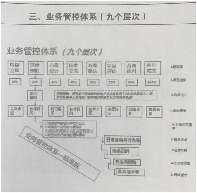 業(yè)務(wù)管控體系的九個(gè)層次是按照從思路到方法執(zhí)行落地的邏輯進(jìn)行設(shè)計(jì)的,包含里程碑、項(xiàng)目進(jìn)度、階段定義、成功標(biāo)準(zhǔn)、工作任務(wù)清單、日?;顒?dòng)、達(dá)成目的方法與策略、具體話術(shù)九個(gè)層次。