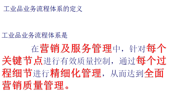 工業(yè)品業(yè)務流程體系的定義是在營銷及服務管理中,針對每個關鍵節(jié)點進行有效質量控制,