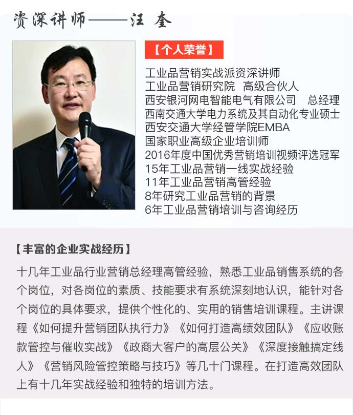 ![]() 招生對象: 工業(yè)電氣自動化、工程機械制造、建筑及安裝工程、化工及工業(yè)原材料、汽車客車、中央空調(diào)暖通設(shè)備、工業(yè)設(shè)備制造、礦采冶金能源、信息通訊設(shè)備、環(huán)保科技設(shè)備等廣大工業(yè)品行業(yè)從事一線的銷售人員及銷售精英、銷售經(jīng)理等 。 上課地點: 上海 浦東 學(xué)費標(biāo)準(zhǔn): 全系統(tǒng)課程費用:16800 元/人/7 天 單次課程費用:2400 元/人/天 (含講師授課、教材費、資料費、證書費、銷售工具包、輔導(dǎo)費; 餐費、交通、酒店自理,可協(xié)助代訂協(xié)議價酒店。) 溫馨提示: 可以報名單次公開課或者分層級系統(tǒng)課程, 詳情請來電咨詢 400-920-6062 |