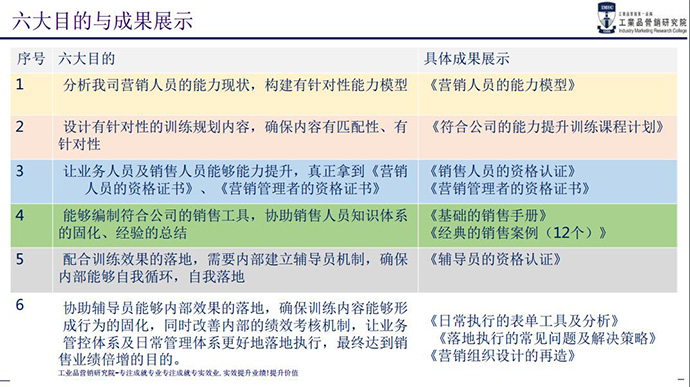 本次培訓(xùn),通過(guò)全面營(yíng)銷(xiāo)人員素質(zhì)能力模型的構(gòu)建和分析,量身定制營(yíng)銷(xiāo)培訓(xùn)方案,旨在系統(tǒng)化提升營(yíng)銷(xiāo)人員的綜合銷(xiāo)售能力,提升營(yíng)銷(xiāo)人員的職業(yè)化素養(yǎng),規(guī)范工業(yè)品營(yíng)銷(xiāo)業(yè)務(wù)流程及階段里程碑任務(wù),系統(tǒng)化訓(xùn)練工業(yè)品營(yíng)銷(xiāo)的技能,咨詢(xún)式一對(duì)一落地輔導(dǎo),導(dǎo)入系統(tǒng)規(guī)范化的銷(xiāo)售手冊(cè),全程采用調(diào)研+分析+分層級(jí)定制化+分階段系統(tǒng)培訓(xùn)+案例演練+工具導(dǎo)入+咨詢(xún)式落地輔導(dǎo)+銷(xiāo)售手冊(cè)導(dǎo)入+跟蹤輔導(dǎo)