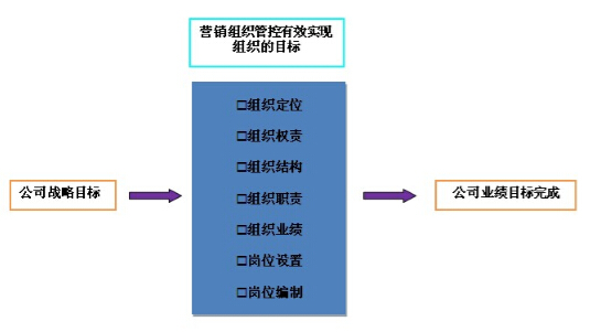 組織管控分為兩部分,一部分是集團公司對于分公司的管控,另一部分是指公司整體對于各分職能部門的管控。而在這里,我們重點分析公司整體對于各分職能部門的管控。對于一個企業(yè)來說,最為重要的是營銷組織,如何進行營銷組織的有效管控,是企業(yè)發(fā)展的關(guān)鍵一步。特別在一些大公司、大集團,以及大部分的工業(yè)品企業(yè),營銷組織的管控更為重要。營銷組織管控是指企業(yè)運用組織設(shè)計來實現(xiàn)公司對營銷組織的管理及控制。營銷組織管控是有效實現(xiàn)組織目標(biāo)的管理手段,通過實施管控將組織目標(biāo)落實到每個崗位,每個員工,最終實現(xiàn)組織的業(yè)績目標(biāo).組織管控圖如圖1所示。