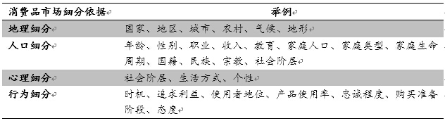 表1 消費(fèi)品市場(chǎng)細(xì)分依據(jù)