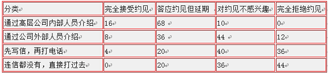 國(guó)外的銷售專家做過類似的調(diào)查,看大部分的公司高層面對(duì)各種不同的商務(wù)約見,都會(huì)做什么回復(fù)。如圖所示: