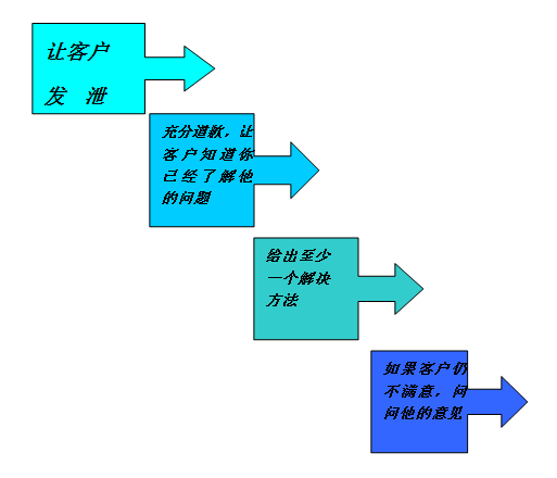 這是誰的問題,企業(yè)能不能解決?有沒有替代的方案?企業(yè)不能解決怎么辦?給一個補償性關照!相信有以上四種形式,足以解決掉決大部分的不滿。針對客戶抱怨的內容和實質,選擇一種恰當的方式進行客戶不滿的平息。
