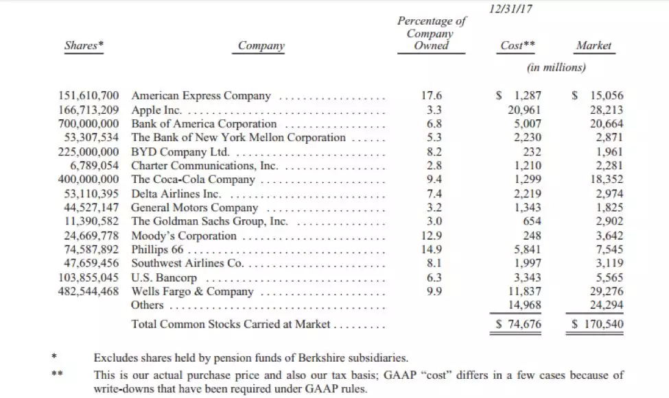 下面是截至年末我們投資的市值最高的15只普通股。這里不計我們在卡夫亨氏中的持股—— 325,442,152股——因為伯克希爾是控股方的一員,必須用“權益法”來衡量該投資。