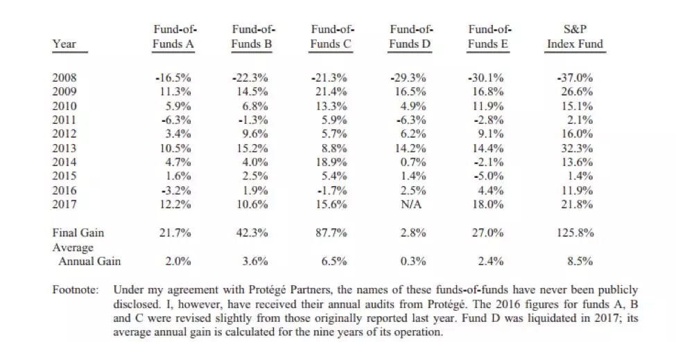 作為我的投資對賭對手,Protégé Partners選擇了五只“基金中的基金”,并預計它將超過標準普爾500指數(shù)。這不是特例。這五只基金中的基金涵蓋了超過200個對沖基金。