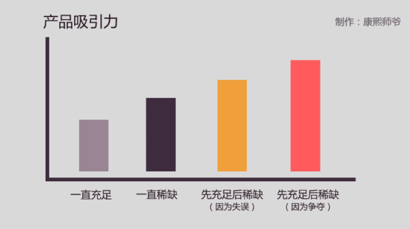 由于爭奪,導(dǎo)致得而復(fù)失的東西,價(jià)值顯得最高,吸引力也最大。這就是饑餓營銷的第三層,也是饑餓營銷的真正含義。