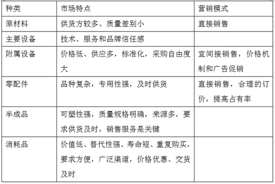 科特勒咨詢公司還專門針對工業(yè)品營銷,開發(fā)了《銷售必殺技--科特勒行動九步》、“行業(yè)營銷戰(zhàn)略”、“價值營銷戰(zhàn)略”、“大客戶營銷三部曲”等工具。 除了以上林林總總針對抽象的“工業(yè)品”的研究,人么還針對工業(yè)品的不同種類,試圖尋找出針對性的營銷模式;如: