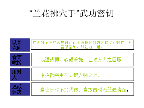 一 “蘭花拂穴手”講究的是以柔克剛。在面對(duì)不同的客戶時(shí),迅速找到對(duì)方之軟肋,對(duì)癥下藥。所表現(xiàn)的攻擊力,往往看似柔和,卻勁力十足。面對(duì)客戶提出的種種要求,不從正面去應(yīng)對(duì);而是先點(diǎn)到對(duì)方的痛楚,再給對(duì)方揉一揉。給一點(diǎn)讓步,讓對(duì)方覺得來(lái)之不易,適可而止。