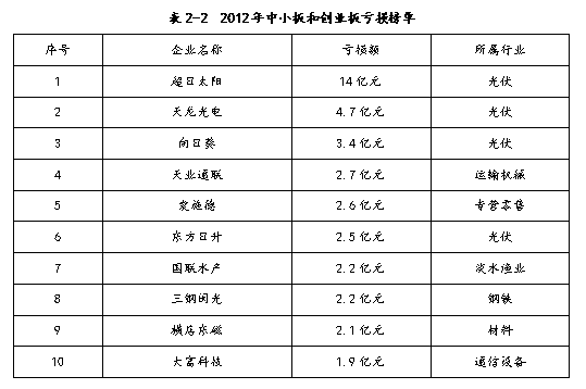 不少中小企業(yè)的老板反映2012年的經(jīng)濟(jì)形勢比08年金融危機(jī)時(shí)還慘,上市公司的年報(bào)顯然印證了這一點(diǎn)。尤其在2012年陷入行業(yè)“冰凍期”的中國光伏行業(yè),更是哀鴻遍野一片。虧損情況如表2-2所示。