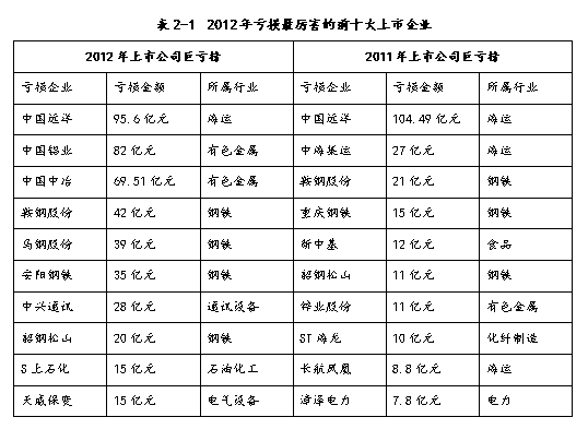 3月27日中國遠(yuǎn)洋披露2012年業(yè)績報(bào)告,95.6億元的巨額虧損使公司連續(xù)第二年成為“虧損王”,同日一起 披露年報(bào)的中國鋁業(yè)、鞍鋼股份、中興通訊和S上石化四家企業(yè)也因巨額虧損成功入選A股巨虧榜前十名。如表2-1所示。