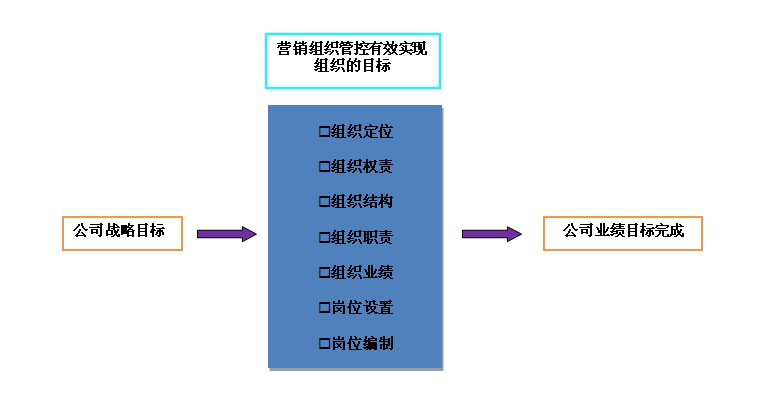 組織管控分為兩部分,一部分是集團(tuán)公司對于分公司的管控,另一部分是指公司整體對于各分職能部門的管控。而在這里,我們重點(diǎn)分析公司整體對于各分職能部門的管控。對于一個(gè)企業(yè)來說,最為重要的是營銷組織,如何進(jìn)行營銷組織的有效管控,是企業(yè)發(fā)展的關(guān)鍵一步。特別在一些大公司、大集團(tuán),以及大部分的工業(yè)品企業(yè),營銷組織的管控更為重要。營銷組織管控是指企業(yè)運(yùn)用組織設(shè)計(jì)來實(shí)現(xiàn)公司對營銷組織的管理及控制。營銷組織管控是有效實(shí)現(xiàn)組織目標(biāo)的管理手段,通過實(shí)施管控將組織目標(biāo)落實(shí)到每個(gè)崗位,每個(gè)員工,最終實(shí)現(xiàn)組織的業(yè)績目標(biāo).組織管控圖如圖2-1所示。