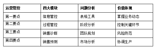 運(yùn)營管控主要是指在營銷過程當(dāng)中對銷售信息的管控、項(xiàng)目的管控及費(fèi)用的管控等,從而實(shí)現(xiàn)一切盡在掌控之中。運(yùn)營管控的實(shí)質(zhì),是資源的管控, 即對企業(yè)擁有的資源進(jìn)行充分的有效調(diào)解。運(yùn)營管控表如表2-3所示。