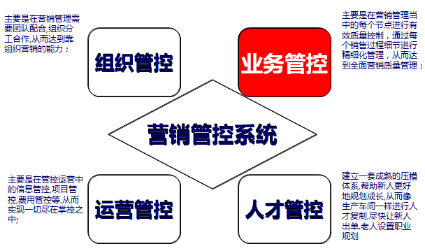 以上出現(xiàn)的問題,很好地解釋了營銷管控過程中重要的四個(gè)關(guān)鍵部分,分別是:組織管控、運(yùn)營管控、人才管控、業(yè)務(wù)管控。