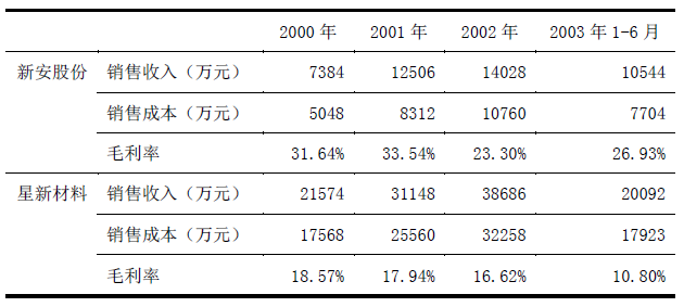 4. 切入有機(jī)硅后的盈利能力表4-4 是根據(jù)上市公司年報(bào)整理的新安股份與江山股份草甘膦產(chǎn)品的盈利能力的對(duì)比。表 4-5 是根據(jù)上市公司年報(bào)整理的新安股份與星新材料有機(jī)硅單體產(chǎn)品的盈利能力的對(duì)比。可以看出新安股份有機(jī)磷有機(jī)硅聯(lián)產(chǎn)項(xiàng)目所帶來(lái)的成本優(yōu)勢(shì)十分明顯。其草甘膦與有機(jī)硅產(chǎn)品的毛利率均高于國(guó)內(nèi)同類產(chǎn)品。 就有機(jī)硅單體生產(chǎn)而言,截至2002年末,新安股份擁有1套1.5萬(wàn)噸/年、1套2萬(wàn)噸/年的生產(chǎn)設(shè)備,總生產(chǎn)能力3.5萬(wàn)噸/年;星新材料擁有1套2萬(wàn)噸/年、1套5萬(wàn)噸/年的生產(chǎn)設(shè)備,總生產(chǎn)能力7萬(wàn)噸/年。 雖然有機(jī)硅單體生產(chǎn)中規(guī)模經(jīng)濟(jì)顯著,根據(jù)經(jīng)驗(yàn)估計(jì),硅氧烷裝置達(dá)到15萬(wàn)噸/年,其生產(chǎn)成本是5萬(wàn)噸/元裝置的60%。但憑借有機(jī)磷有機(jī)硅聯(lián)產(chǎn)工藝,新安股份的有機(jī)硅單體的毛利率比擁有兩倍生產(chǎn)規(guī)模的星新材料還要高6.7-16.1個(gè)百分點(diǎn)。