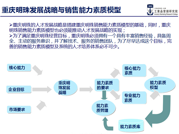 經(jīng)過工業(yè)品營銷研究院和重慶明珠的共同努力和配合,研究院為重慶明珠業(yè)務(wù)流程管控方案和運(yùn)營管控方案已在明珠內(nèi)部開始執(zhí)行落實(shí),配套的PSM軟件也正在按計(jì)劃使用;績效薪酬方案已經(jīng)完成;能力模型方案已經(jīng)構(gòu)建完畢,對銷售人員的培訓(xùn)起了很大的指導(dǎo)作用,針對業(yè)務(wù)人員的專業(yè)銷售技能培訓(xùn)也已經(jīng)結(jié)束,整體營銷管控體系的搭建,將有力推動重慶明珠沖擊億元銷售額。